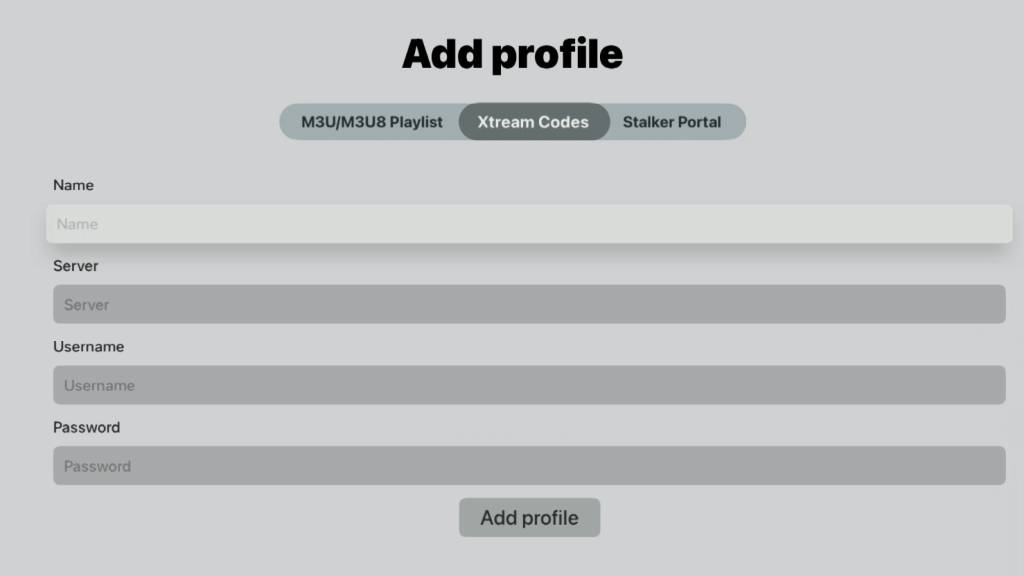 Välj “Xtream Codes”, som är det mittersta alternativet på bilden nedan. I fältet “Name” skriver du “Express Iptv /”. I fältet “Server” fyller du i din Portal URL, som du får från oss vid gratis test eller köp. Tryck sedan på knappen “Add profile”.