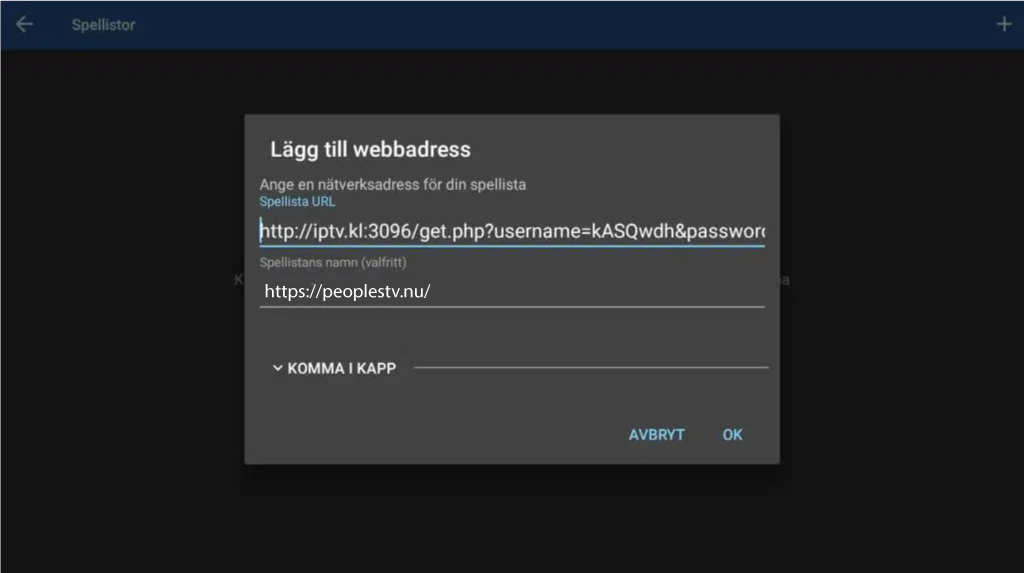 Starta appen och tryck på plustecknet uppe i hörnet. Kopiera sedan din M3U-länk som du fått från oss via e-post. Klistra in den i fältet “Spellista URL”. I fältet “Spellistans namn” fyller du i “svenskiptv.com”.