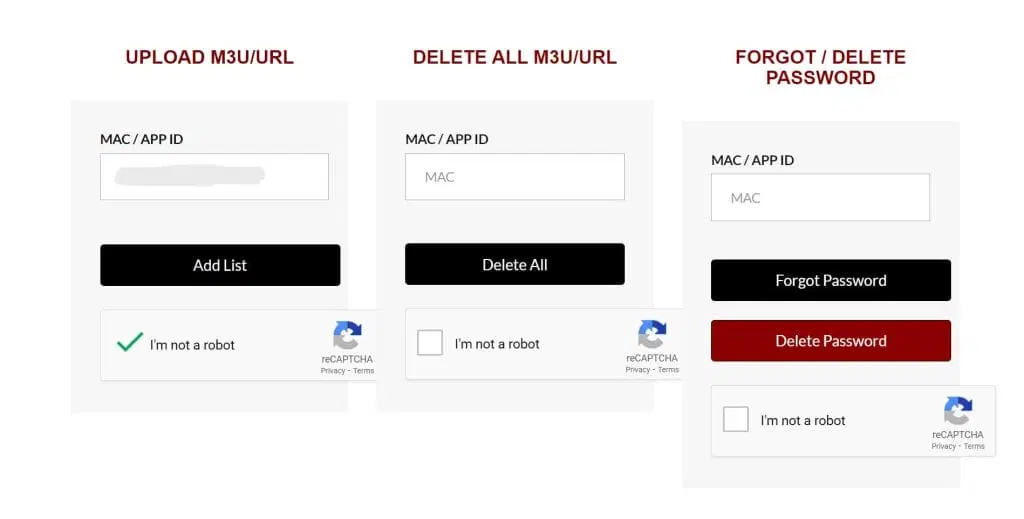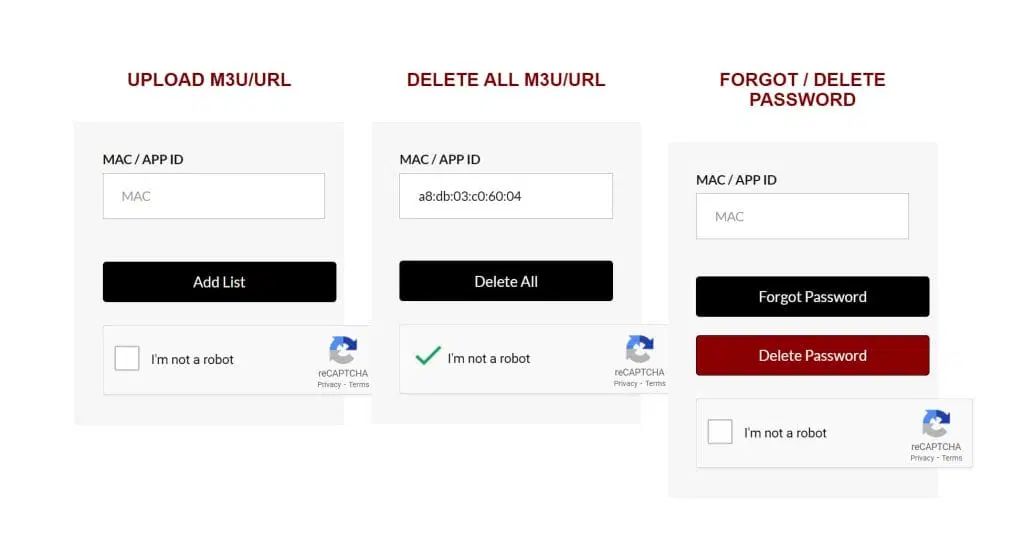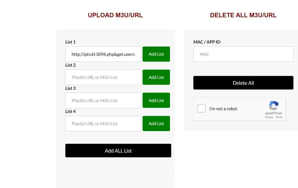 Besök nu https://netiptv.eu/upload och fyll i din MAC-adress i rutan “Delete All M3u/URL”. Kryssa sedan i rutan “I’m not a robot” och tryck på “Delete All”.